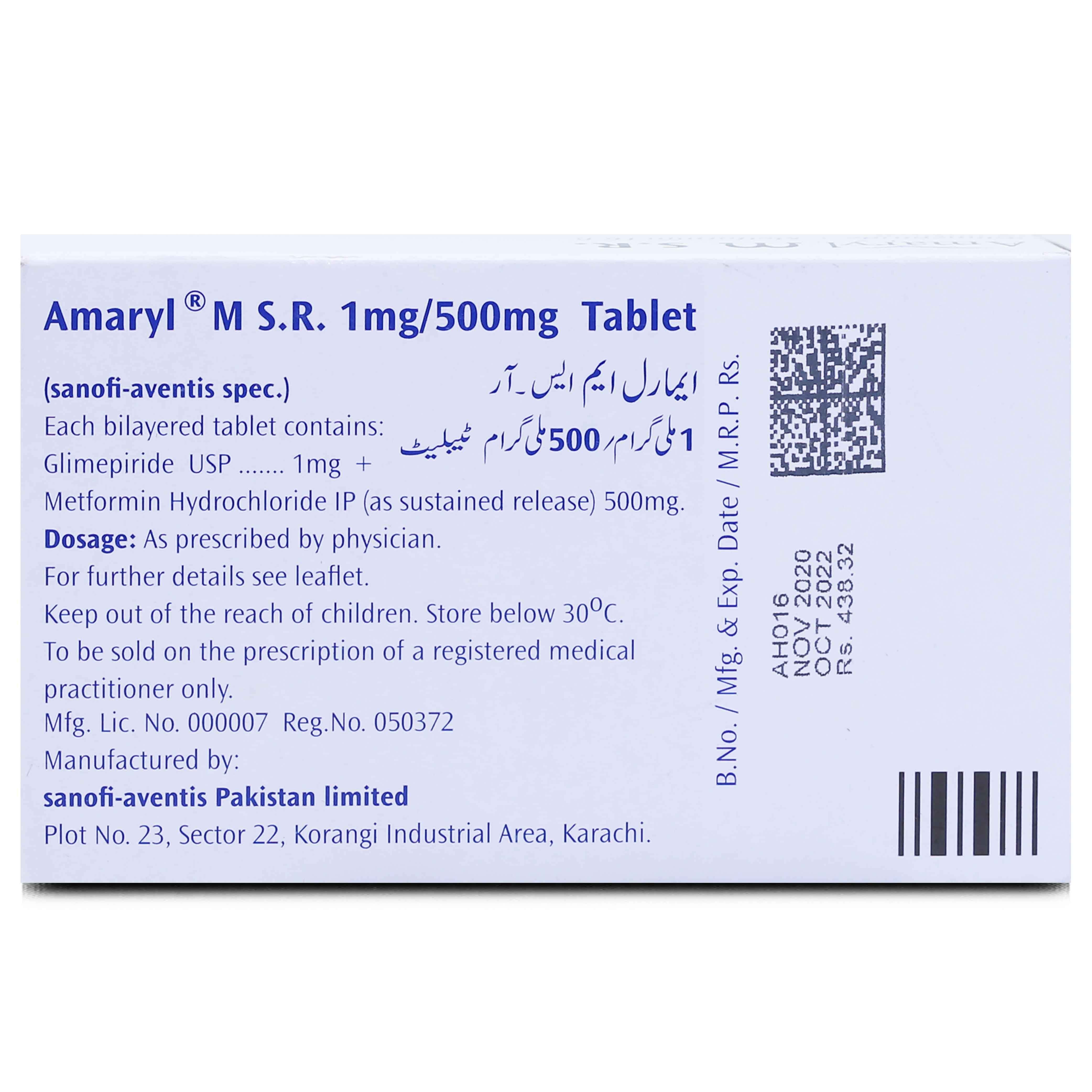 Key facts about Amaryl MSR 1mg+500mg Tablet 10 ‘S