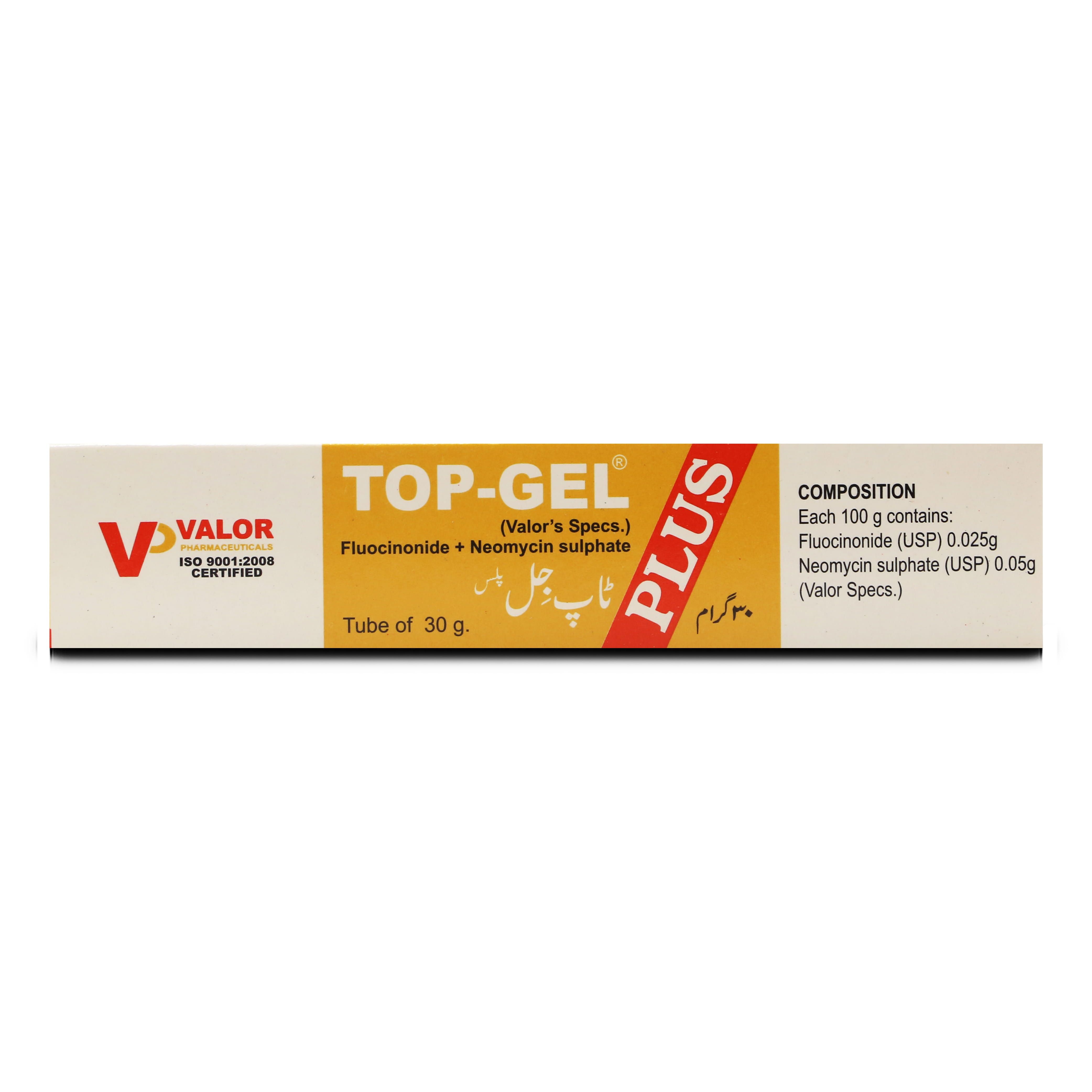 Top Plus Gel 30 gm contains Fluocinolone Acetonide and Neomycin which acts by reducing inflammation exhibited by swelling and redness, as well as inhibiting protein synthesis in susceptible bacteria and disrupting the cell membrane. Therapeutic outcomes of Top Plus Gel 30 gm have been well-received due to its dual mode of action against inflammatory skin conditions.